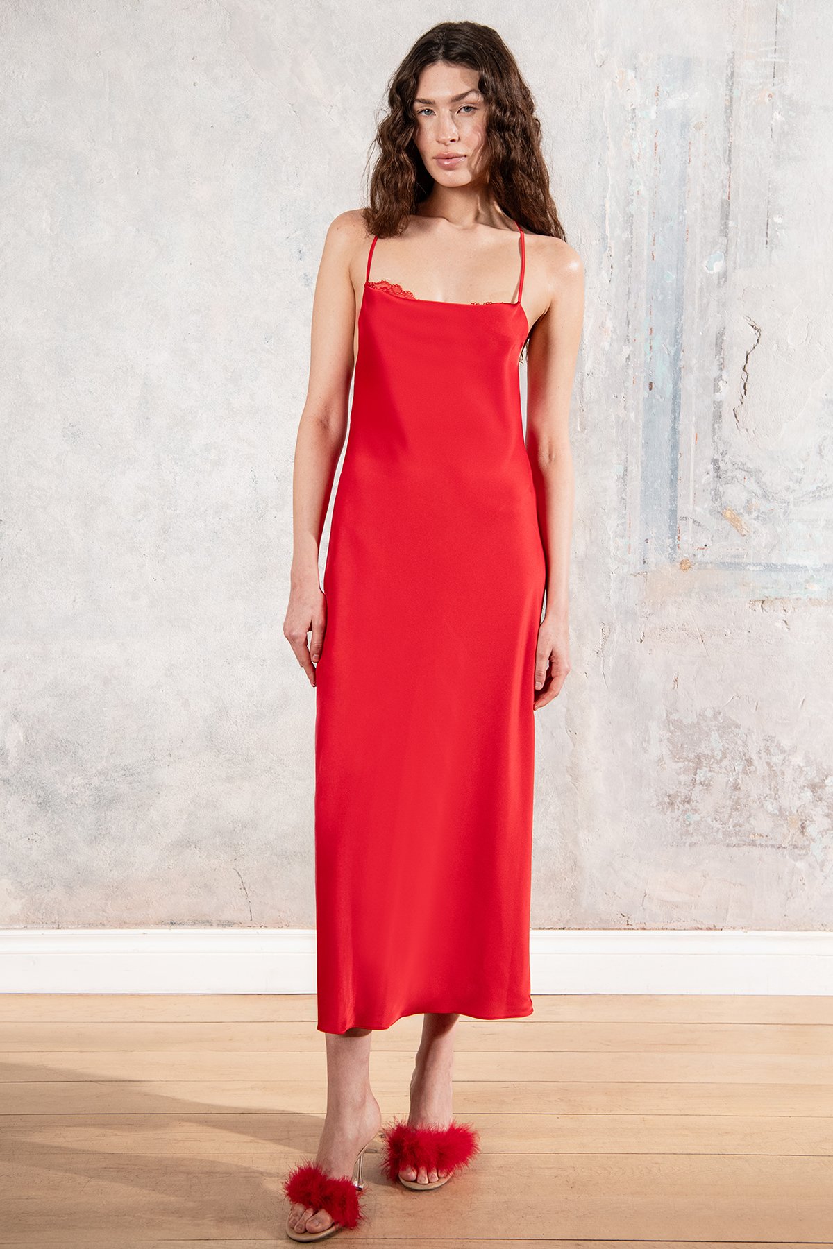 İsabella Красная атласная ночная рубашка миди на бретельках с кружевной отделкой